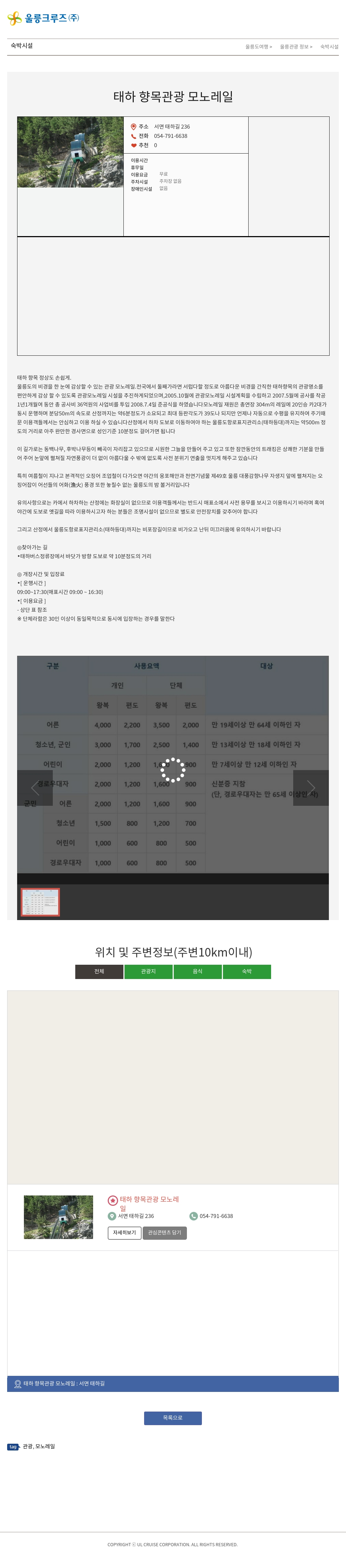 울릉도의 비경을 한 눈에 감상할 수 있는 관광 모노레일.전국에서 둘째가라면 서럽다할 정도로 아름다운 비경을 간직한 태하향목의 관광명소를 편안하게 감상 할 수 있도록 관광모노레일 시설을 추진하게되었으며,2005.10월에 관광모노레일 시설계획을 수립하고 2007.5월에 공사를 착공 1년1개월여 동안 총 공사비 36억원의 사업비를 투입 2008.7.4일 준공식을 하였습니다모노레일 재원은 총연장 304m의 레일에 20인승 카2대가 동시 운행하며 분당50m의 속도로 산정까지는 약6분정도가 소요되고 최대 등판각도가 39도나 되지만 언제나 자동으로 수평을 유지하여 주기때문 이용객들께서는 안심하고 이용 하실 수 있습니다산정에서 하차 도보로 이동하여야 하는 울릉도항로표지관리소(태하등대)까지는 약500m 정도의 거리로 아주 완만한 경사면으로 성인기준 10분정도 걸어가면 됩니다