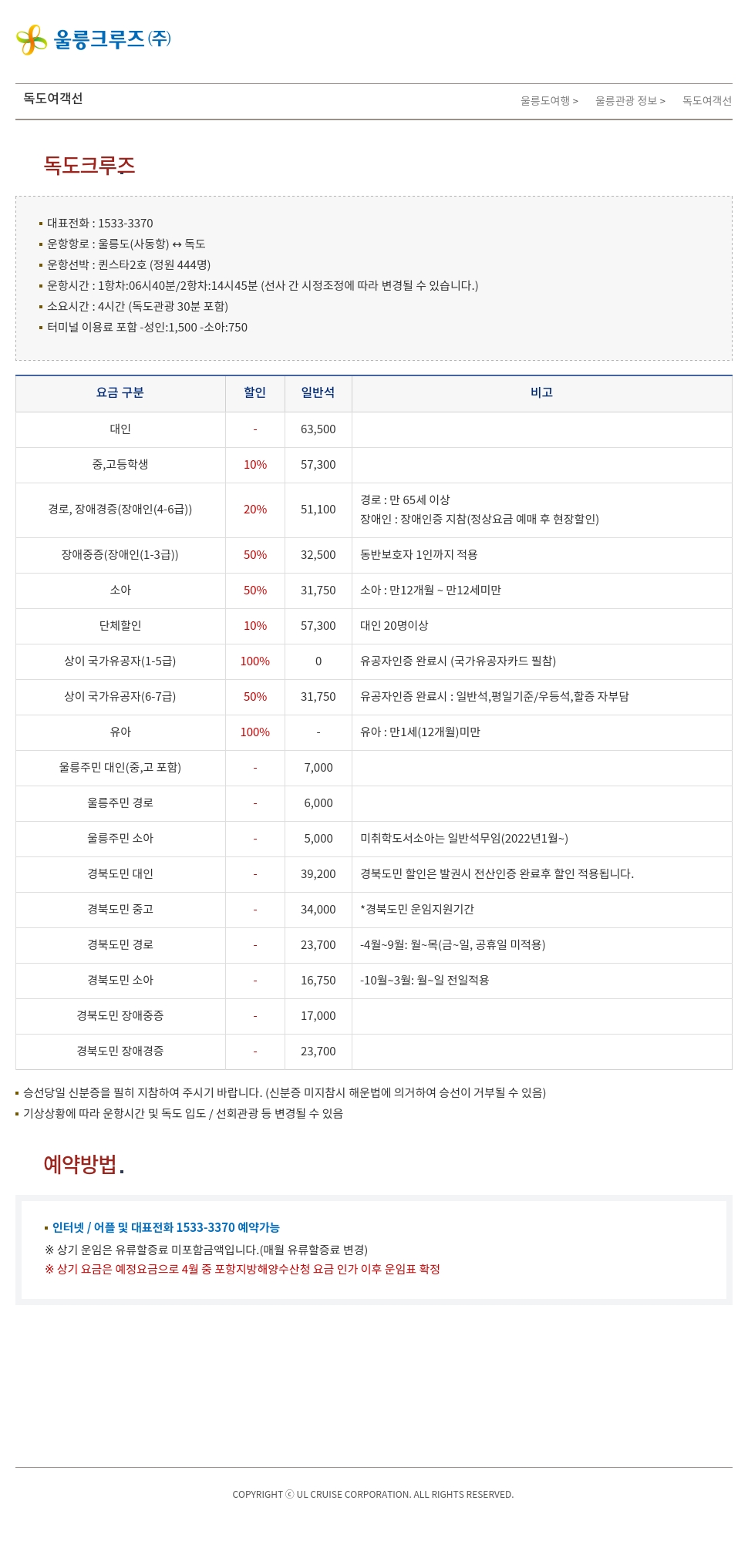 - 기상상황에 따라 운항시간 및 독도 입도 / 선회관광 등 변경될 수 있음