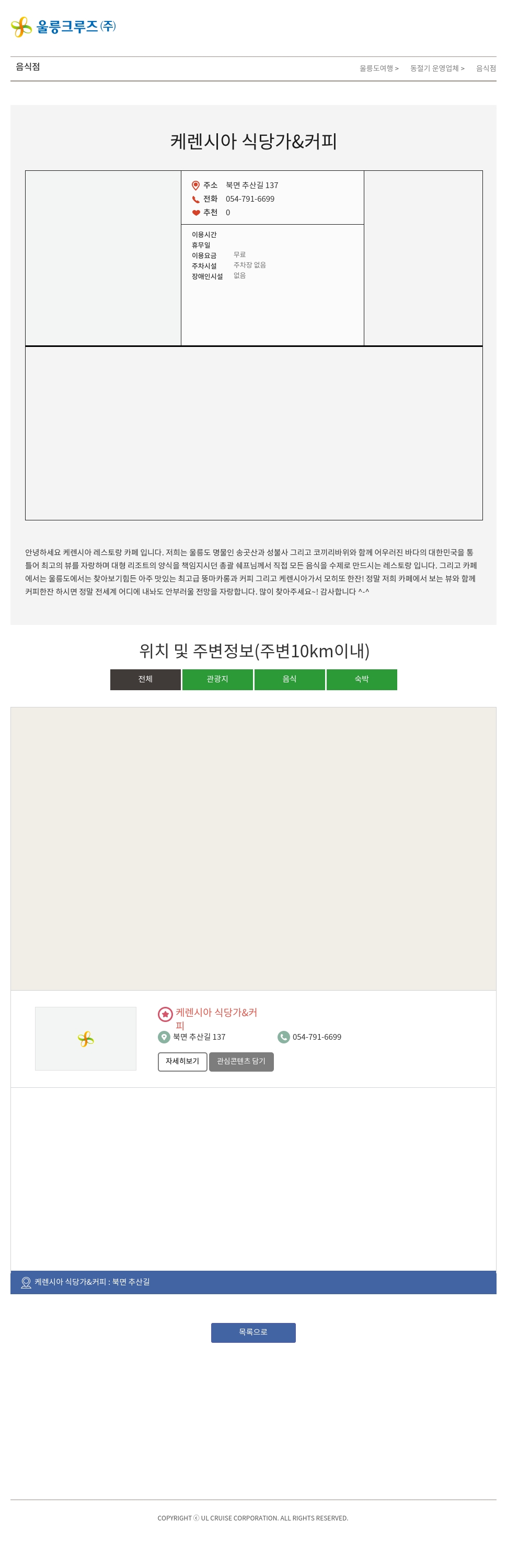 안녕하세요 케렌시아 레스토랑 카페 입니다. 저희는 울릉도 명물인 송곳산과 성불사 그리고 코끼리바위와 함께 어우러진 바다의 대한민국을 통틀어 최고의 뷰를 자랑하며 대형 리조트의 양식을 책임지시던 총괄 쉐프님께서 직접 모든 음식을 수제로 만드시는 레스토랑 입니다. 그리고 카페에서는 울릉도에서는 찾아보기힘든 아주 맛있는 최고급 뚱마카롱과 커피 그리고 케렌시아가서 모히또 한잔! 정말 저희 카페에서 보는 뷰와 함께 커피한잔 하시면 정말 전세계 어디에 내놔도 안부러울 전망을 자랑합니다. 많이 찾아주세요~! 감사합니다 ^-^
